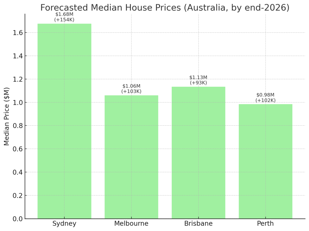 - Sydney: median house prices are tipped to rise by about +$154,000 by end 2026 (to ~$1.676 M).