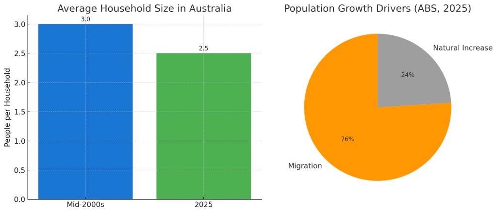 Population growth is now almost entirely driven by migration. Net overseas migration makes up about 76% of population growth (births are low), concentrating demand in capital cities. At the same time, Australian households are getting smaller. The average household has fallen from ~3 people to about 2.5abs.gov.au. For example, official [ABS data] (June 2025) reports an average of ~2.5. Smaller households mean many more dwellings are needed to house the same population.