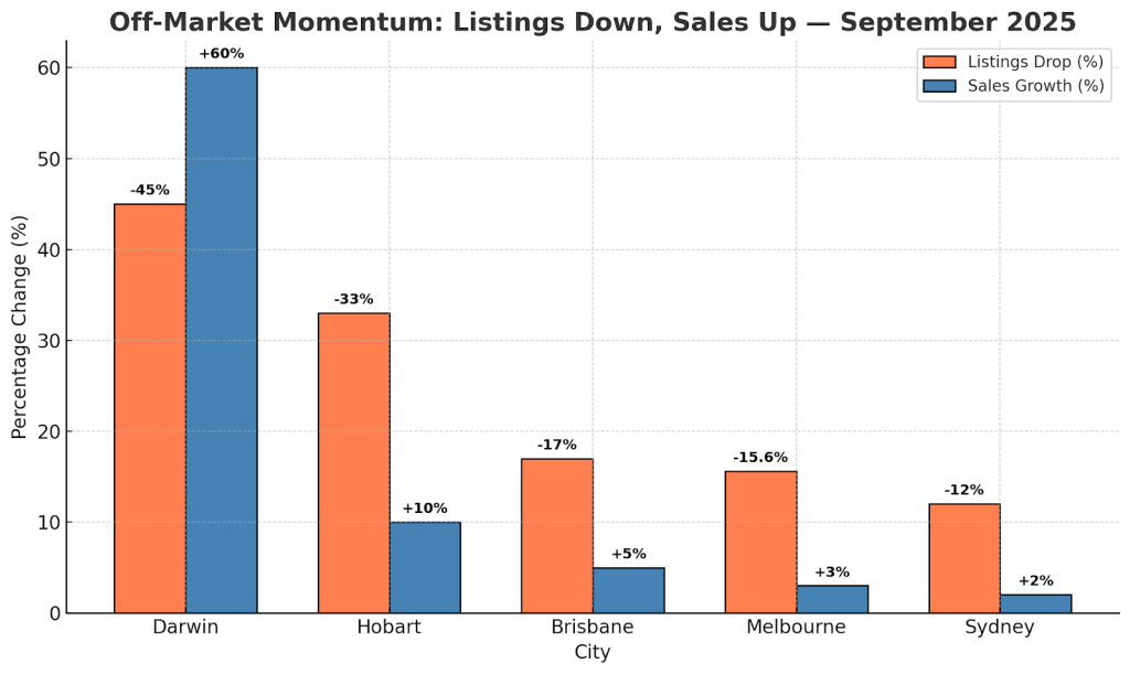 Off-market properties are becoming a hot topic for homebuyers. With the national market showing stronger sales but far fewer listings, smart buyers are getting creative. Recent analysis shows sales up almost 3% as stock levels down 15%. In Darwin, for example, listings are down 45% while sales jumped 60%. Across other capitals, Hobart is -33%, Brisbane is -17%, Melbourne is -15.6%, and Sydney is -12% in listed stock. Overall, inventory is roughly 20% below the five-year average. For context, up to 20% of homes sell off-market each year – private deals are a sizable part of the market.