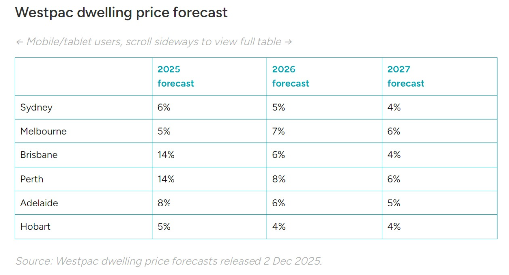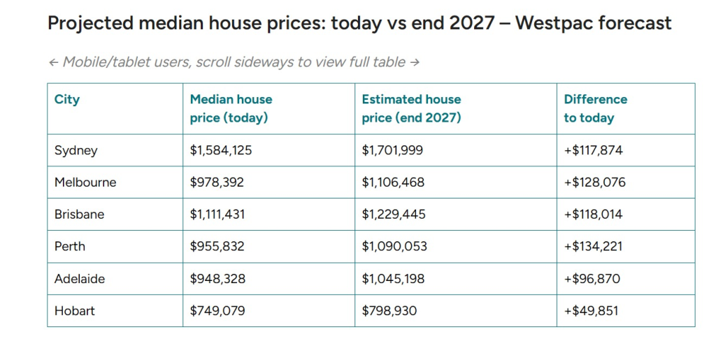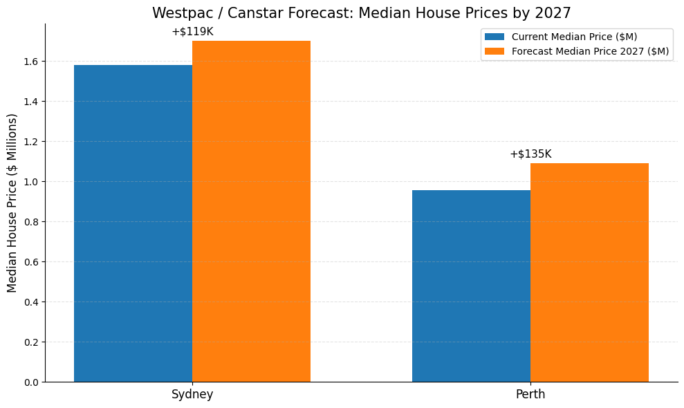 As buyer’s agents based in Sydney, we pay close attention when headlines say “median house prices could rise by up to $134,000 by 2027”. Westpac’s latest outlook (analysed by Canstar) suggests, for example, Sydney’s median home might climb from $1.58M to $1.70M (≈+$120K), and Perth’s from $955K to $1.09M (≈+$134K) by end-2027. In fact, if forecasts play out, five of the six major cities would have median house prices over $1 million. These figures underline that housing in Australia remains in a strong upswing – but they are forecasts, not certainties.
