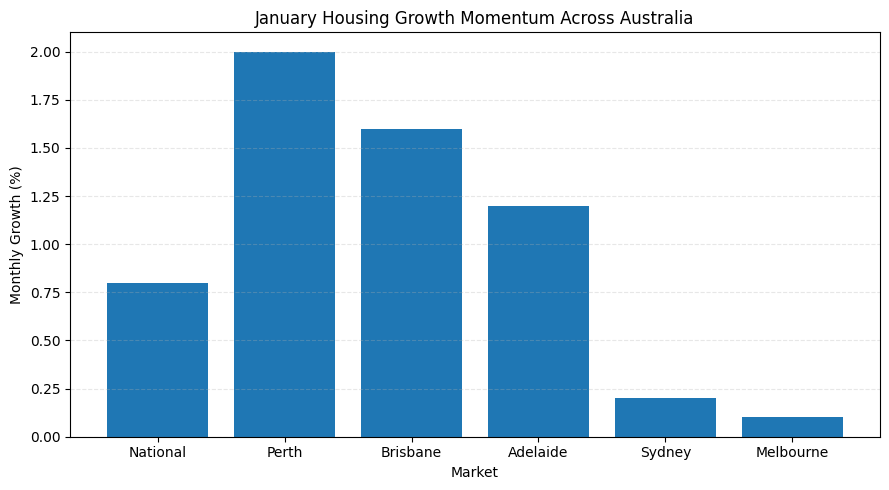 - New milestones: The median house price is now over $900K, and housing value is record‑high in most states. In fact, Perth (+2.0% MoM), Brisbane (+1.6%) and Adelaide (+1.2%) led gains in Jan, while growth in Sydney (+0.2%) and Melbourne (+0.1%) has slowed to marginal levels.